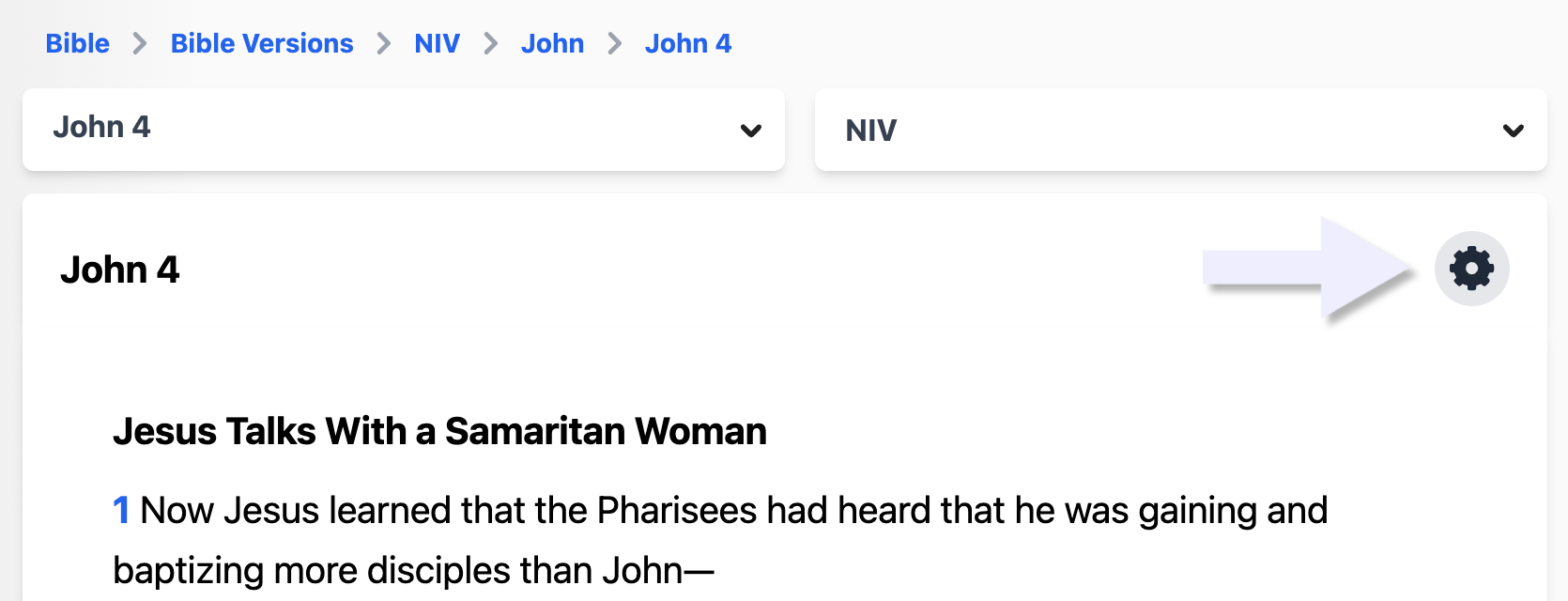 You can access Strong's Concordance by simply searching or browsing the King James Version or New American Standard Bible (use either the main search box above or the simplified one below). Once you've chosen a passage, tap or click the gear icon at the top right of the reading pan. It looks like this: